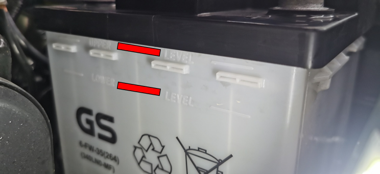 從電池側(cè)面檢查液位,確認液位在UPPER LEVEL(最高液位)與LOWER LEVEL(最低液位)之間,當液面低于最低液位時,請及時前往一汽豐田經(jīng)銷店,補充專用電解液,并使用專用蓄電池檢測儀進行測試,發(fā)現(xiàn)異常后及時更換。